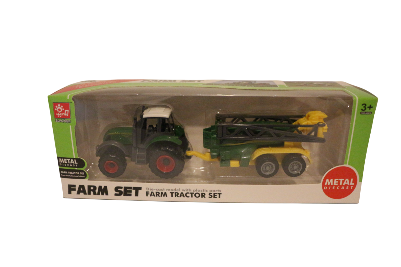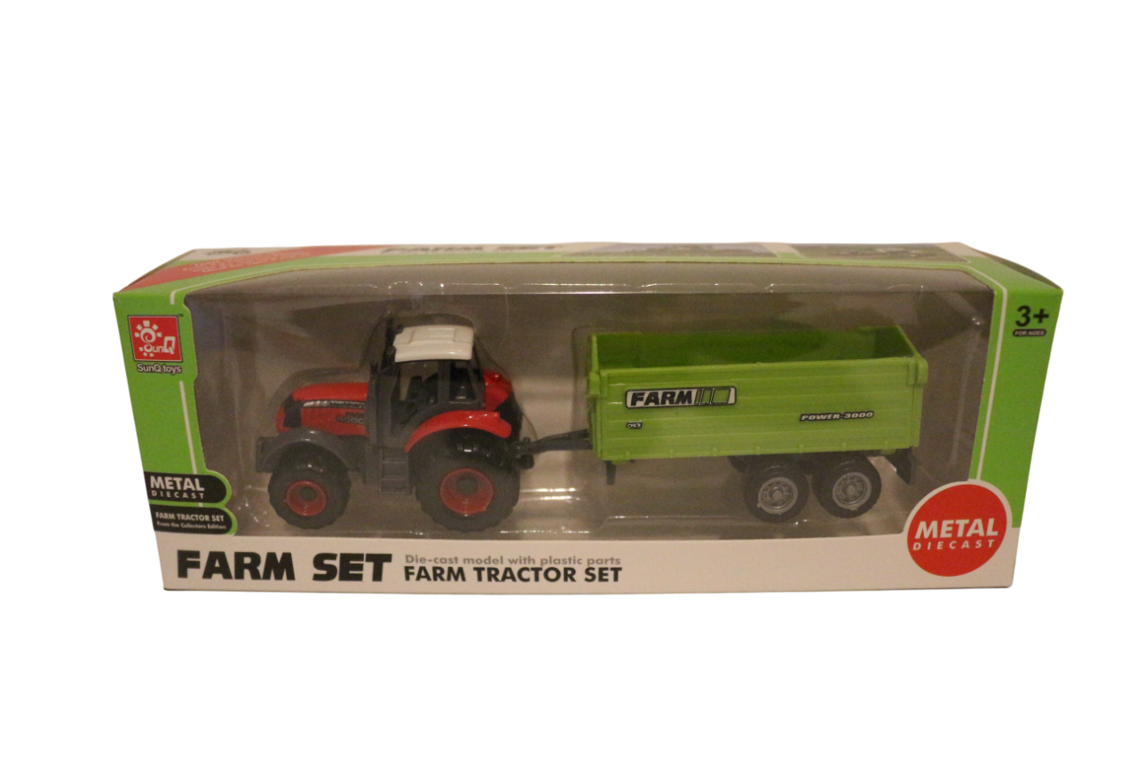 De set bevat een gegoten model van een tractor en een aanhanger met plastic onderdelen. Het speelgoed is geschikt voor kinderen vanaf 3 jaar en de verpakking vermeldt dat het van metaal is en gegoten. De tractor en aanhangwagen zijn ontworpen om landbouwmachines na te bootsen