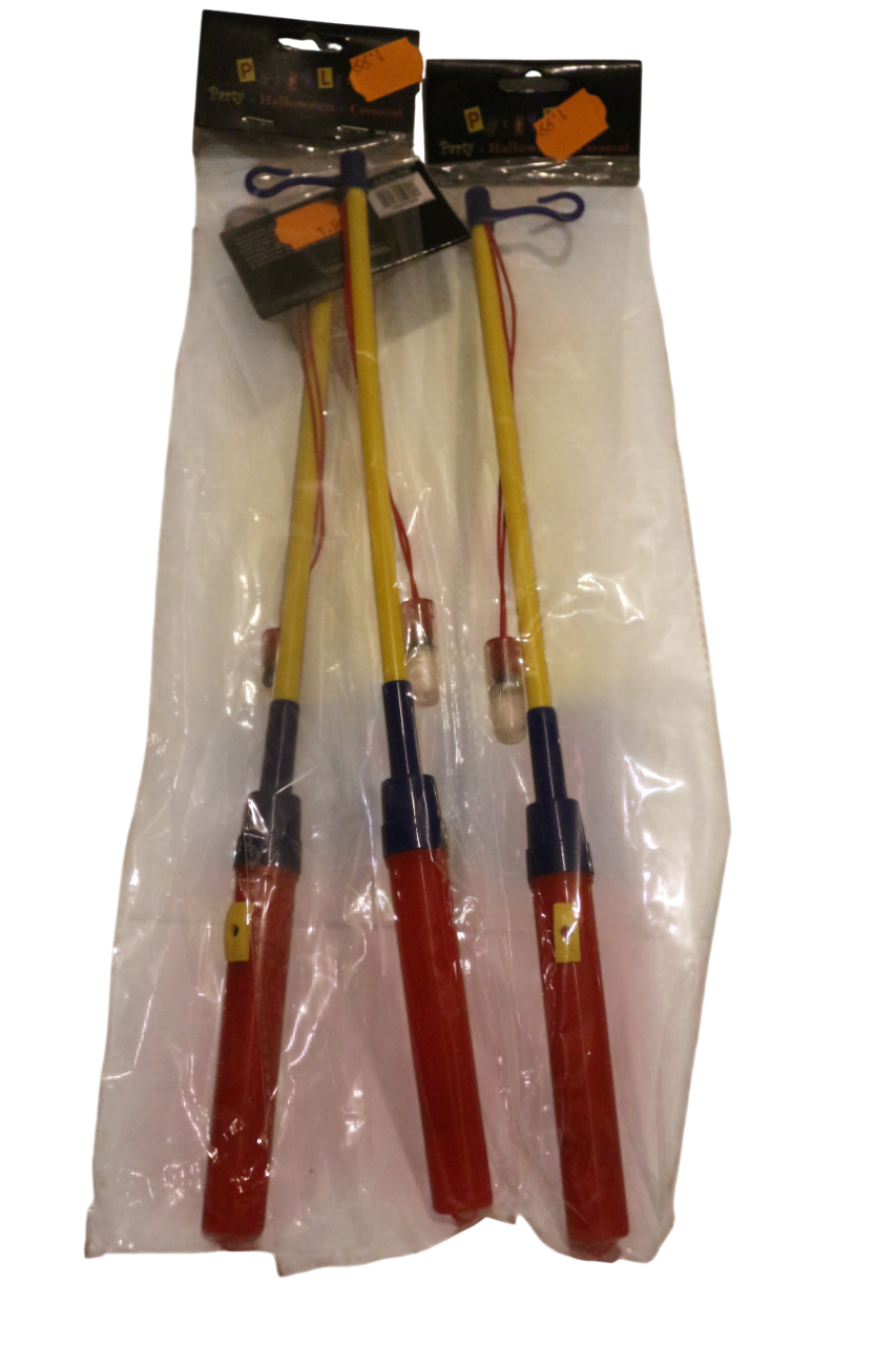 Lampionstokje met lampje, geschikt voor alle leeftijden. Decoratief en geeft licht. Lengte: 50 cm. Materiaal: 66% polypropyleen, 5% ijzer, 23% pvc, 5% koper, 1% glas. Pakket bevat een elektrische lampionstok, batterijen niet inbegrepen (2 x AA).