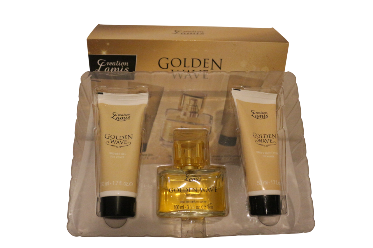The Creation Lamis Golden Wave Women Giftset includes a shower gel, a 100 ml eau de parfum, and a hand and body lotion. Its top notes feature neroli, bitter orange, and raspberry, while the heart reveals orange blossom absolute and jasmine absolute. The base is enriched with warm honey and earthy patchouli. From the Lamis Creation brand, this boxed parfum set falls under the water of parfum category for women