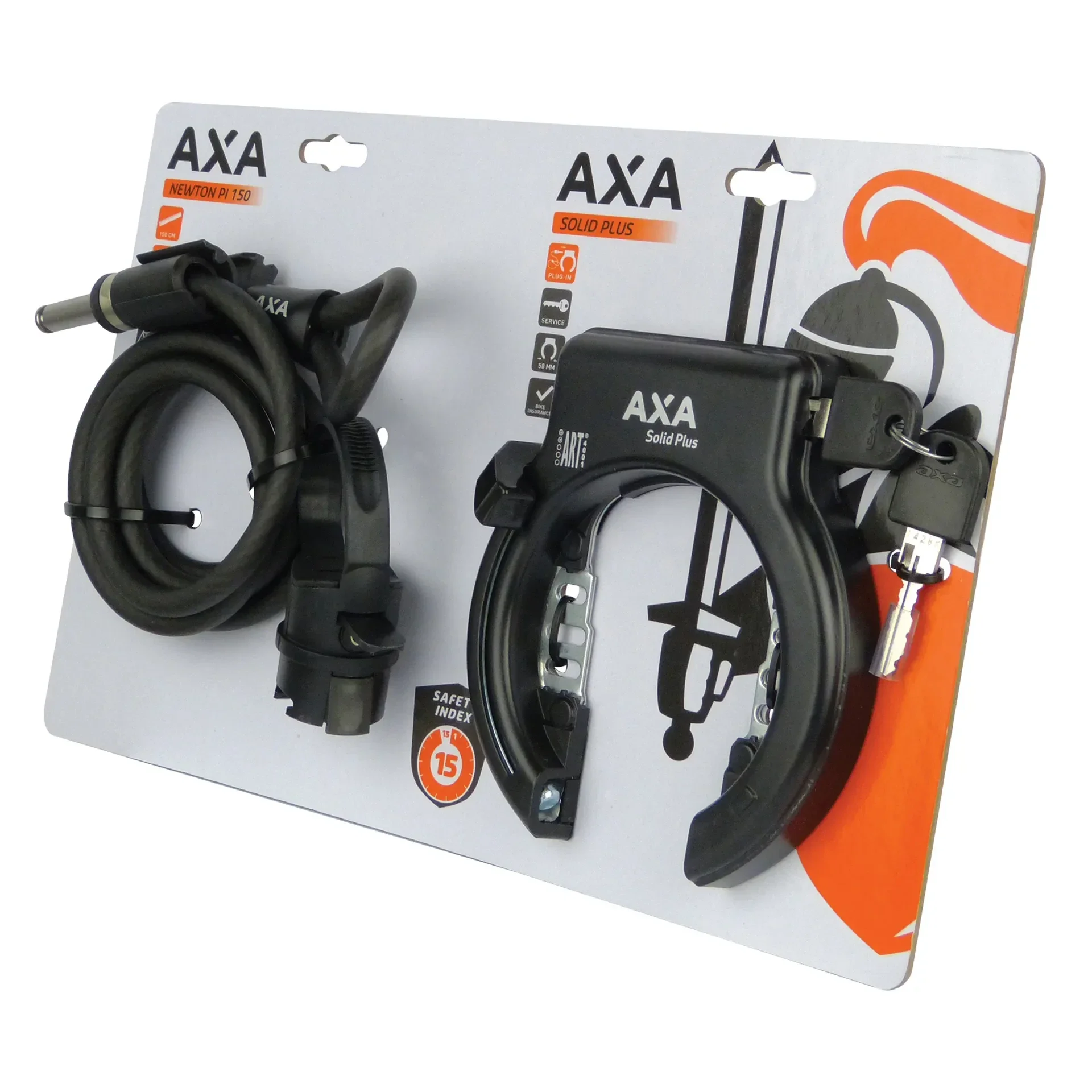 Axa slot set, bestaande uit een Axa Solid Plus ringslot en een Axa Newton Plug In kabel PI 150