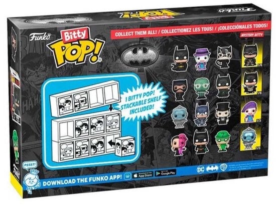 Funko Bitty POP! Seline Kyle, The Riddler, Batman & Mystery POP! van DC Batman. De POPs zijn gemaakt van PVC en ongeveer 2 cm groot. Inclusief stapelbare display.