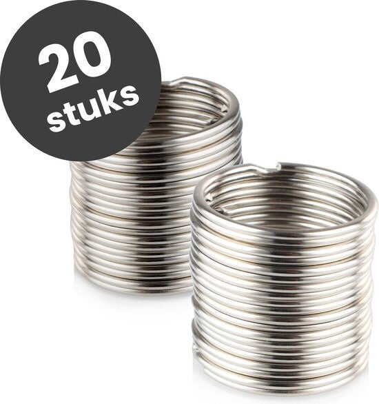 Deze set van 20 stevige, zilverkleurige sleutelringen met een diameter van 20 mm is de ideale keuze voor zowel praktisch gebruik als creatieve projecten. De sleutelringen zijn gemaakt van hoogwaardig metaal en bieden duurzaamheid en stevigheid, waardoor ze perfect zijn voor het organiseren van sleutels, het maken van sleutelhangers of het samenstellen van accessoires zoals tassenhangers of sieraden.
